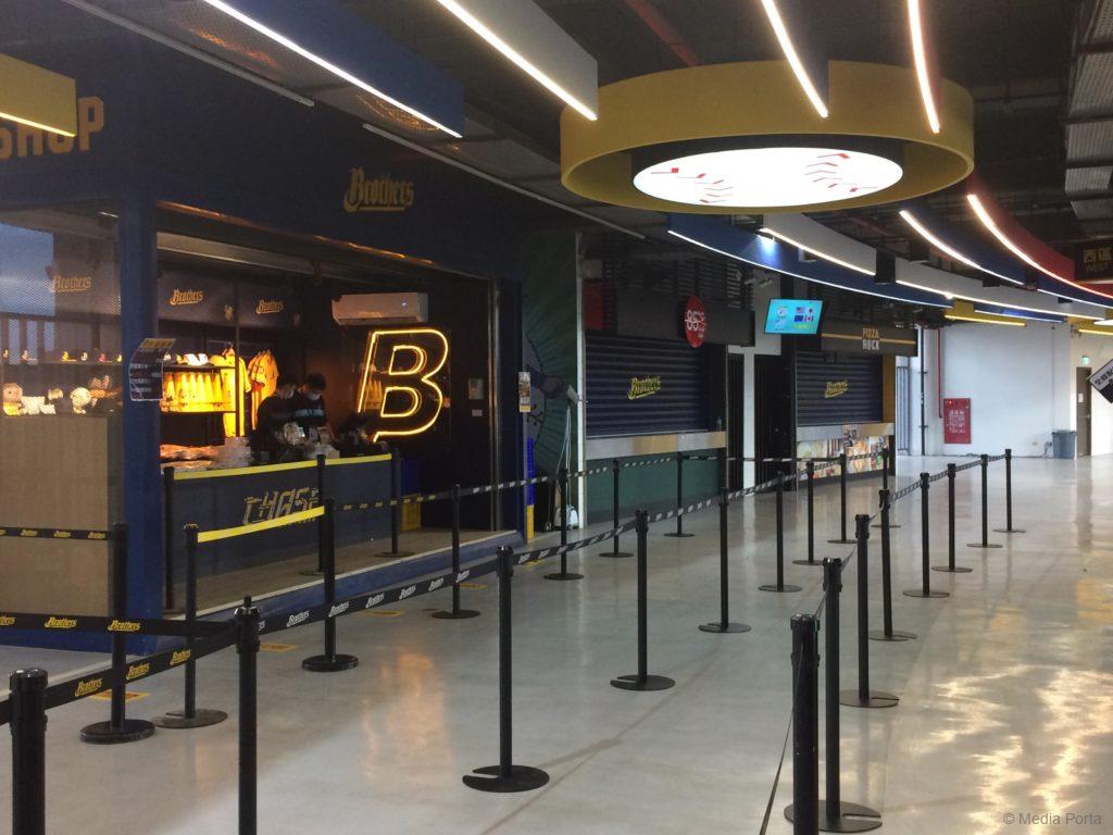 内野のみ開放、ソーシャルディスタンスを守るため、3席空けて1人、3列おきに着席。入場時もここ1ヶ月で外国に行っていないか宣誓書を書かされ、食事も禁止。荷物が厳密に検査されました。さらにプロショップ以外の飲食店も全店休業していました。