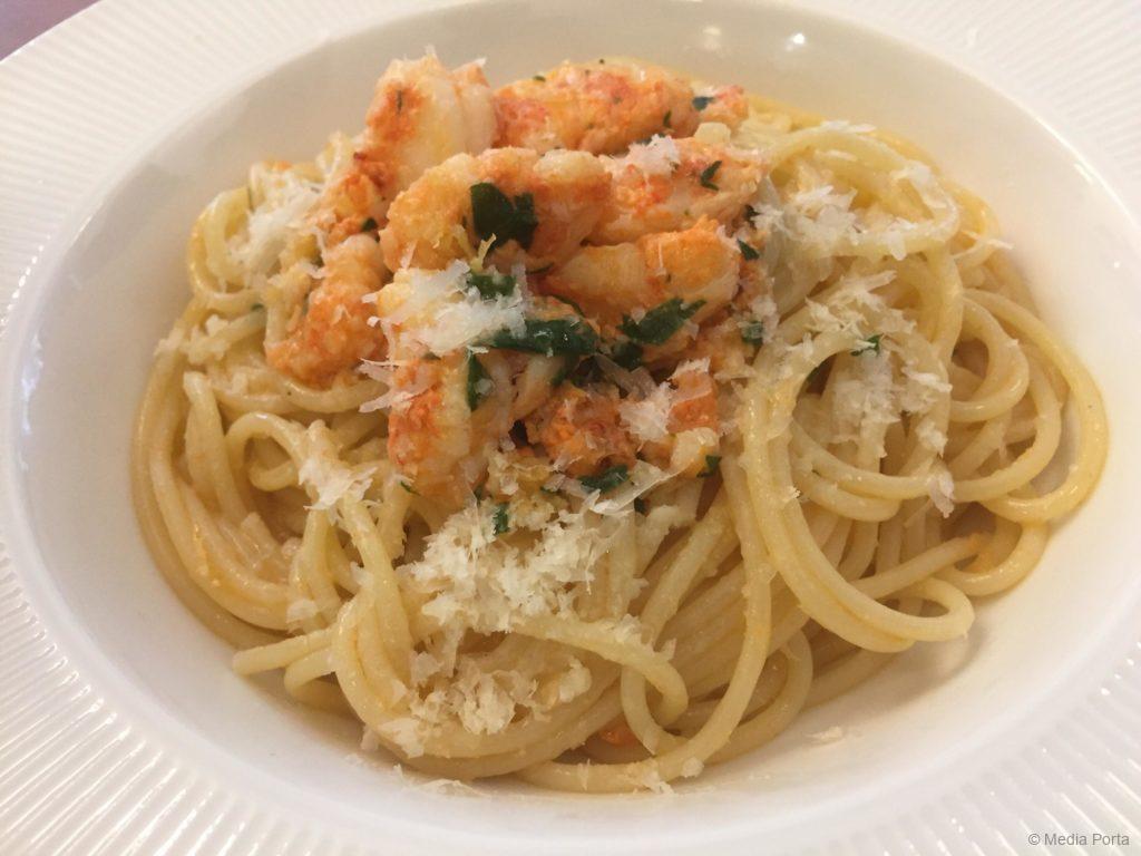 おすすめは窪田シェフの作るパスタのセット。ケーキとお茶がついて399元(税別)。ほのかなレモン風味がエビによく合います。